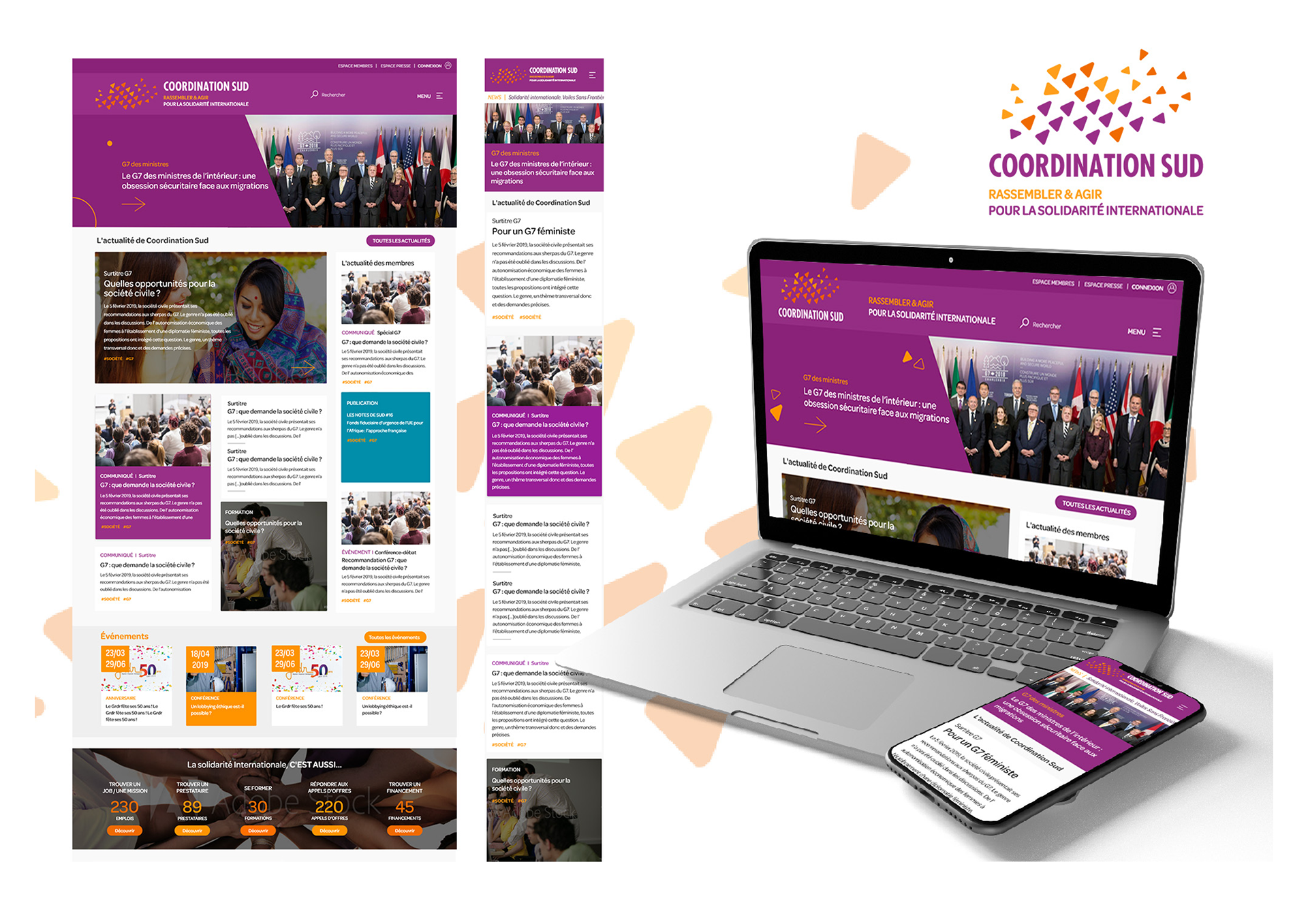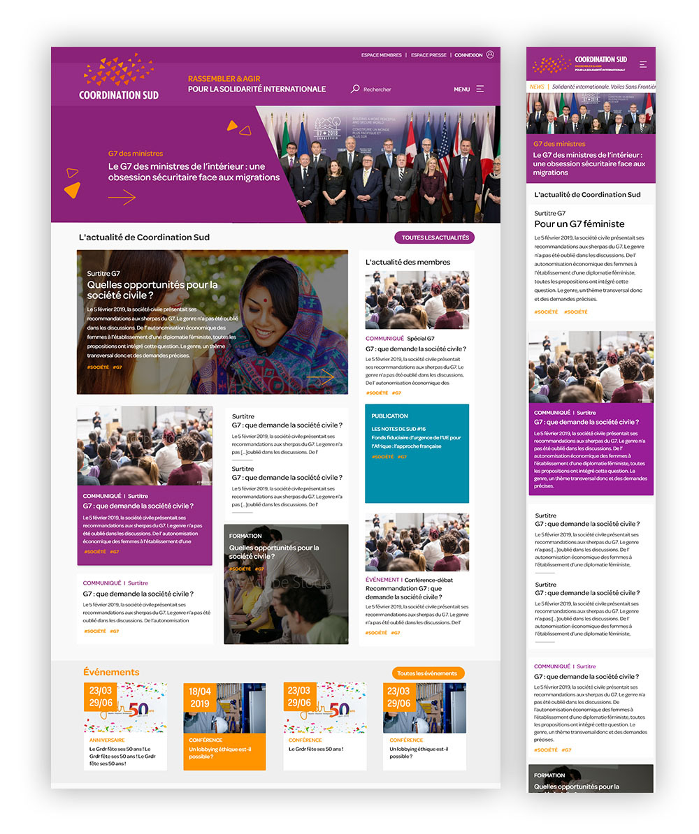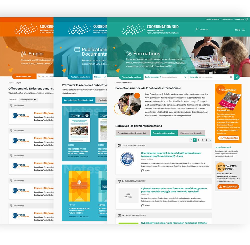 Depuis 2018, j'accompagne Coordination Sud sur son identité graphique et sa déclinaison sur tous les supports (print et web) : identité visuelle, documents print (études, guides, rapport, etc.); conception UI-UX du site web