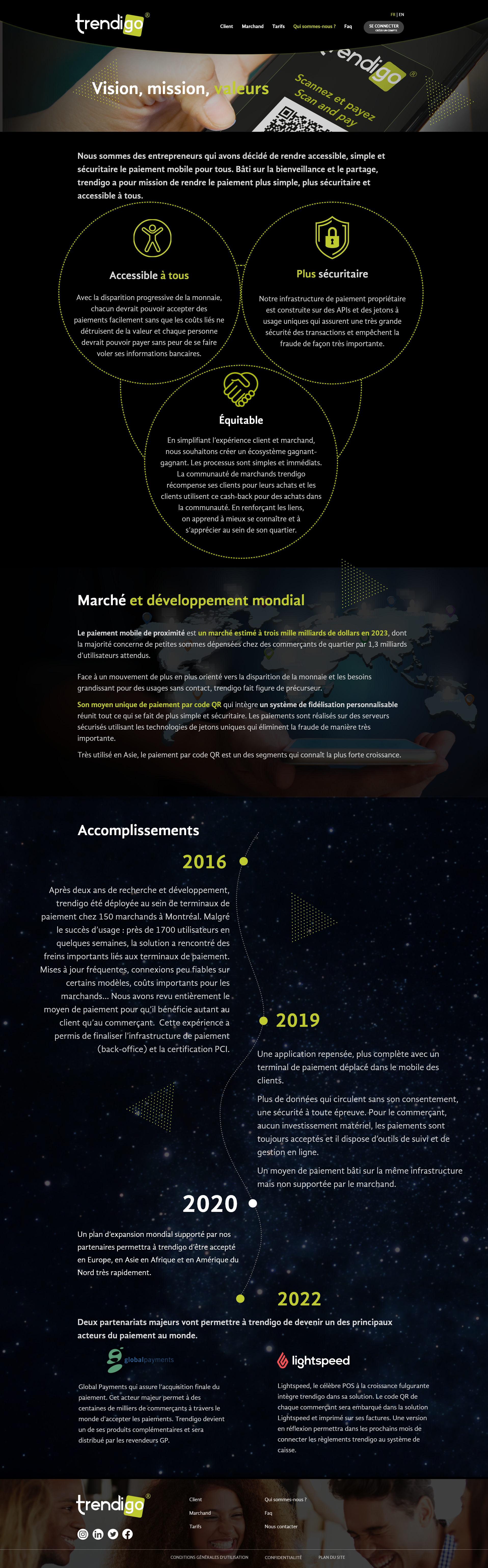 Création graphique du site vitrine de la solution Trendigo, solution de paiement mobile